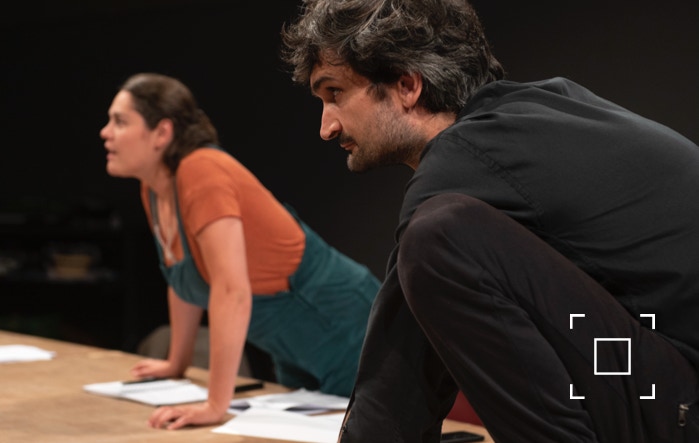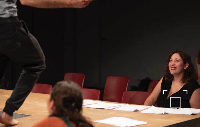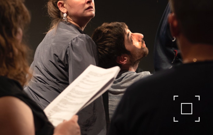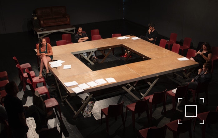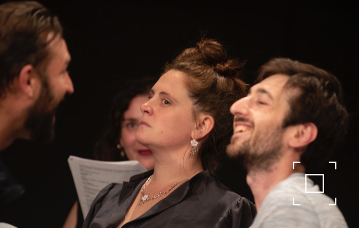 Cette adaptation de la pièce la plus connue de Gombrowicz (assumée comme une réécriture de Hamlet) est en réalité une performance d’1h30 dans laquelle on voit les acteurs de la troupe de La Luzège en Corrèze inventer leur partition physique (le geste scénique) avec la méthode polonaise basée sur la forme et le contraste. Cette méthode reprend des éléments de la théorie de la forme pure du peintre et auteur S.Witkiewicz, et s’inscrit dans la tradition du metteur en scène polonais Tadeusz Kantor. L’idée de «performance» traduit la tentative de repenser les modes de production au Théâtre en proposant d’offrir au public, pour un soir, le «processus transparent» de la création : sur le plateau, la metteure en scène dirige les sept comédien.nes en jeu et les guide vers le grotesque des situations tout en partant de leur propositions personnelles. La disposition circulaire permet d’abolir un moment la séparation scène/salle, de casser l’illusion d’un spectacle « clé en main ».